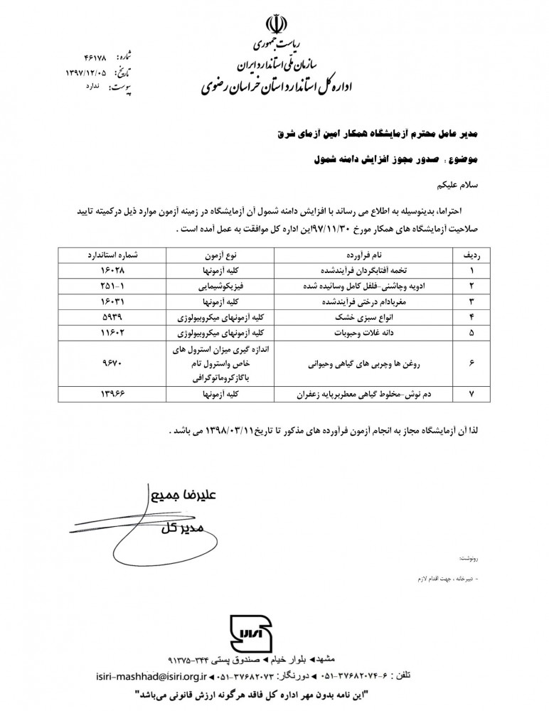 موافقت با افزایش دامنه شمول موسسه امین آزمای شرق